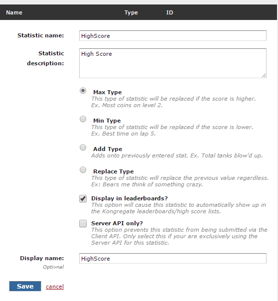 You will also notice that high score was submitted using a key “HighScore”. “HighScore” is name of the statistic that you would need to create in your game once your game is uploaded to Kongregate (If you are still wondering, once you upload the game in Kongragate, there is a Statistics API section in upload game page where you can create a statistic and give it a name which can be used later on in the game’s code for submitting the statistic from the game).